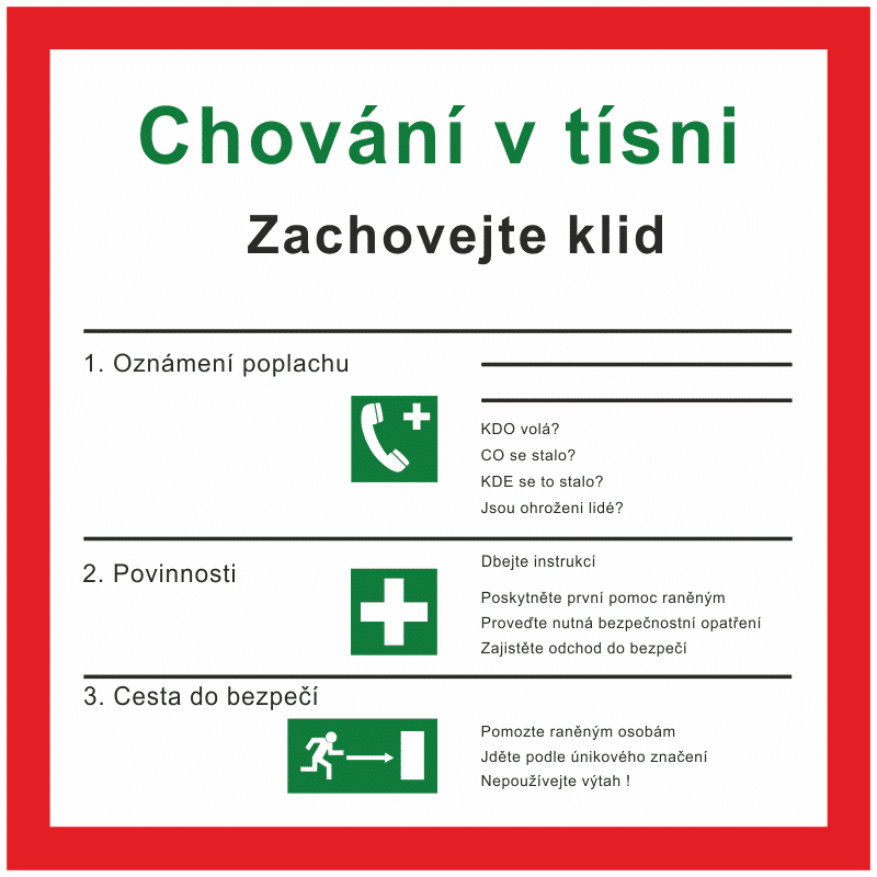 Znalost správného chování v tísni a krizových situacích může zachránit životy a minimalizovat škody. Tato tabulka slouží jako významný prvek v rámci bezpečnostního plánu a měla by být dodržována všemi osobami ve vašem objektu, aby byla zachována maximální bezpečnost.