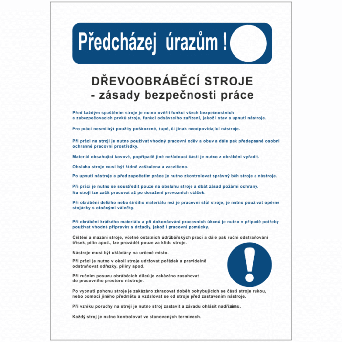 Značka s nápisem “Dřevoobráběcí stroje – zásady bezpečnosti práce” označuje místo, kde platí specifické bezpečnostní zásady a pravidla pro bezpečnou práci s dřevoobráběcími stroji