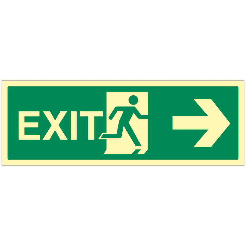 Fotoluminiscenční symbol “EXIT s šipkou směřující doprava” má význam označit místo, kde se nachází východ z budovy nebo prostoru a ukázat směr, kterým by osoby měly jít, aby dosáhly tohoto východu, který se nachází ve směru doprava. Jeho význam zahrnuje následující body: