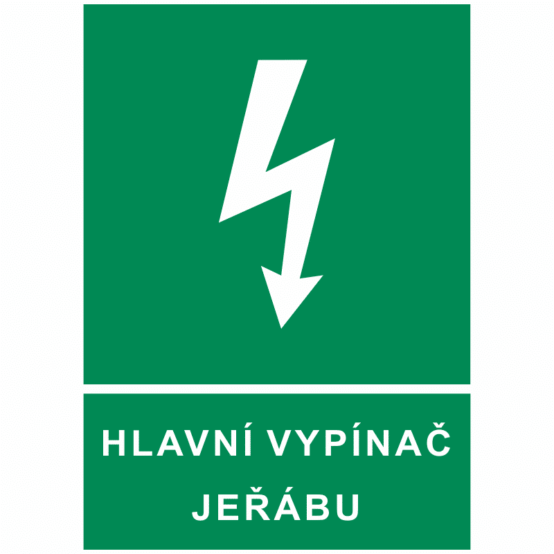 Značka “Hlavní vypínač jeřábu” signalizuje místo, kde se nachází hlavní vypínač nebo spínač pro ovládání jeřábu, slouží k okamžitému zastavení pohybu jeřábu v případě potřeby, jako je havárie nebo riziko úrazu