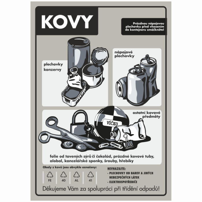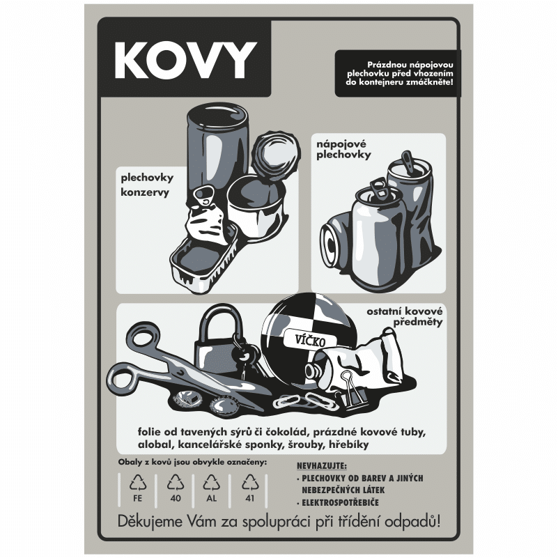 Značka na separovaný odpad “KOV” se používá k označení kontejnerů nebo nádob, kam lze vkládat kovový odpad pro recyklaci.