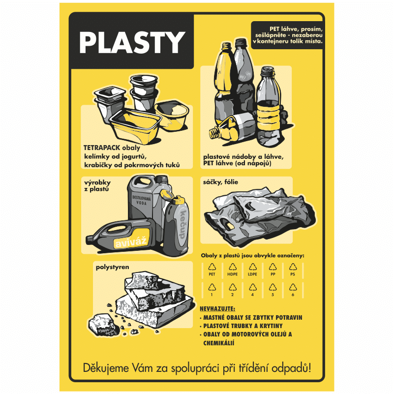 Značka na separovaný odpad “PLAST” je používána k označení kontejnerů nebo nádob, kam je možné vkládat plastový odpad na recyklaci.
