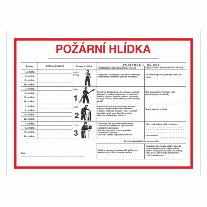 1. Připomenutí povinností: Tato značka slouží k připomenutí členům požární hlídky jejich specifických povinností v rámci požární ochrany ve firmě. To může zahrnovat rychlou reakci na vznikající požár, organizaci evakuace, kontrolu požárního vybavení a další povinnosti.