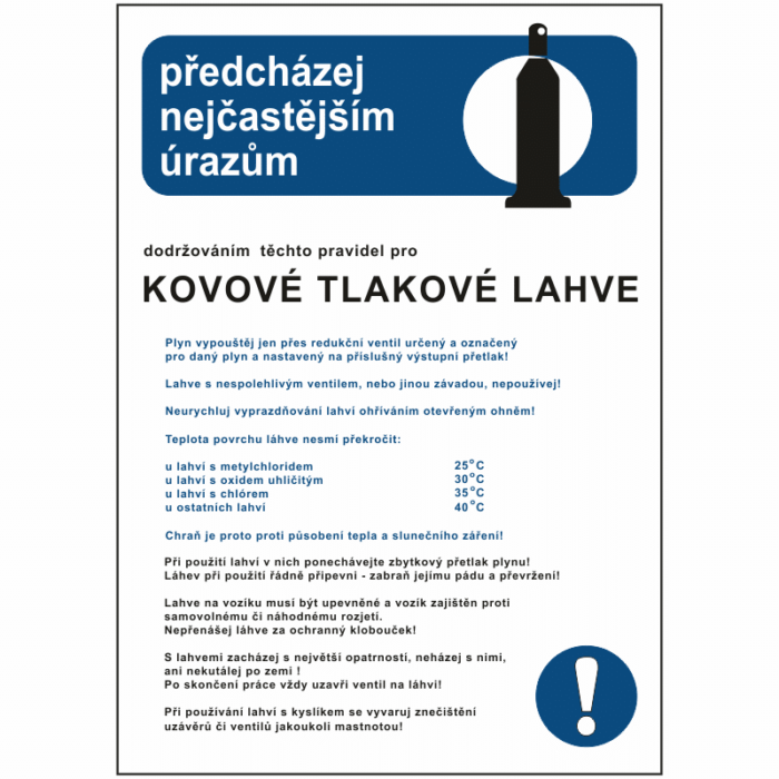 Celkově tato značka “Pravidla bezpečné práce pro kovové tlakové lahve na plyny” slouží k informování pracovníků o důležitosti bezpečnosti a dodržování příslušných bezpečnostních pravidel a směrnic při práci s tlakovými lahvemi obsahujícími plyny. Bezpečnostní postupy by měly být vždy respektovány, aby se minimalizovalo riziko úrazů a zajistila ochrana zdraví při manipulaci s těmito lahvemi.