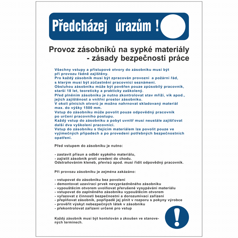 Celkově tato značka “Provoz zásobníků na sypké materiály” slouží k informování pracovníků o důležitosti bezpečnosti a dodržování příslušných bezpečnostních pravidel a směrnic při manipulaci a provozu zásobníků na sypké materiály. Bezpečnostní postupy by měly být vždy respektovány, aby se minimalizovalo riziko úrazů, nehod a škod na majetku.