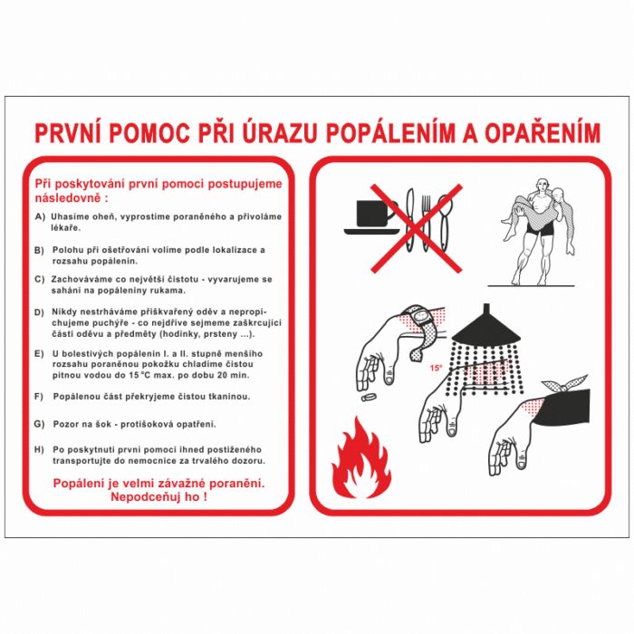 - Ochrana a ochrana postižené osoby: První pomoc při popáleninách zahrnuje správné postupy pro ochranu a ošetření postižené osoby. Značka může také obsahovat pokyny pro prevenci infekce a dalších komplikací.