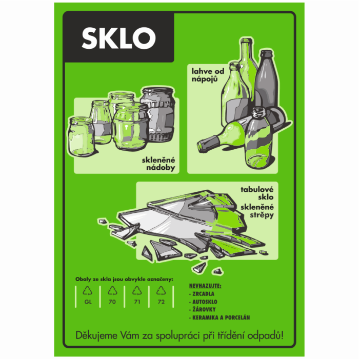 1. Označení pro sklo: Tabulka obsahuje jasné označení “Sklo,” což umožňuje snadno identifikovat místa, kam má být umístěn skleněný odpad.