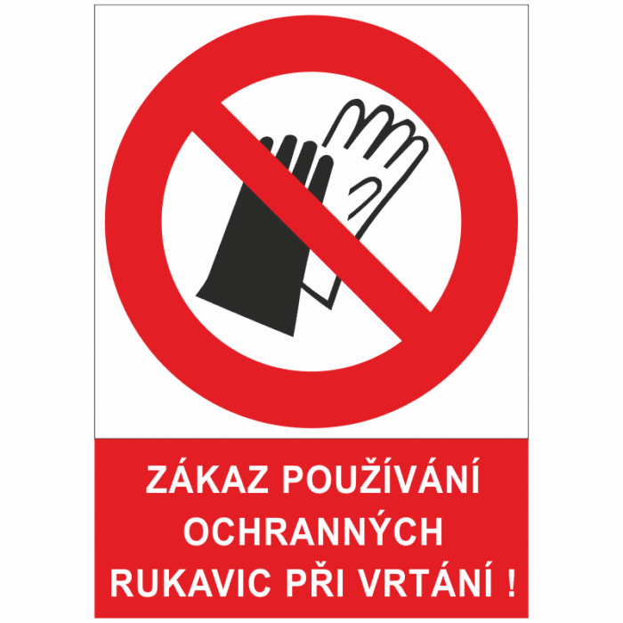 Značka “ZÁKAZ POUŽÍVÁNÍ OCHRANNÝCH RUKAVIC PŘI VRTÁNÍ” zdůrazňuje nepoužívat ochranné rukavice konkrétně při vrtní, kde by použití ochranných rukavic mohlo způsobit nebezpečí nebo kde by bylo jejich použití nevhodné.